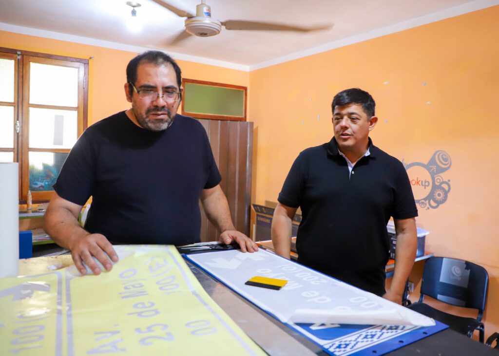 En la presentación de la nueva señalética, estuvo presente el intendente Dr. Matías Espejo, junto al Secretario de Infraestructura Lucas Sosa, quienes juntos a la prensa visitaron el taller metalúrgico de José Zepeda, de quien depende la fabricación de la cartelería, luego se dirigieron al taller gráfico de Eduardo Hernández, profesional encargado del ploteo, cuyo diseño pertenece a Hugo Aguado.