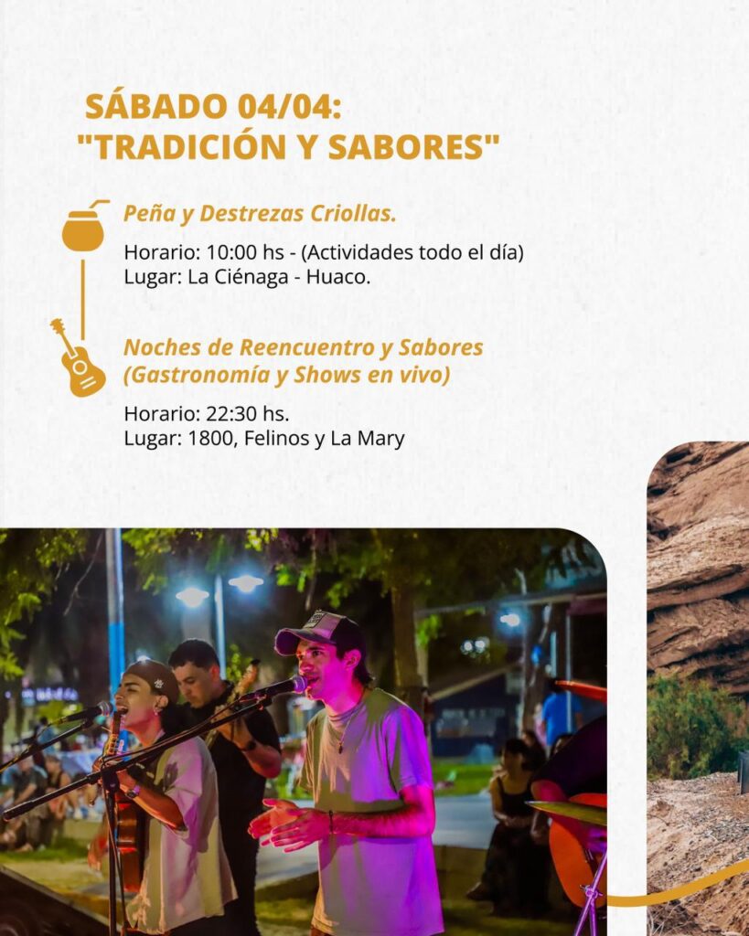 - 10:00 hs: “Peña y Destrezas Criollas” en La Ciénaga, Huaco (actividades durante todo el día).