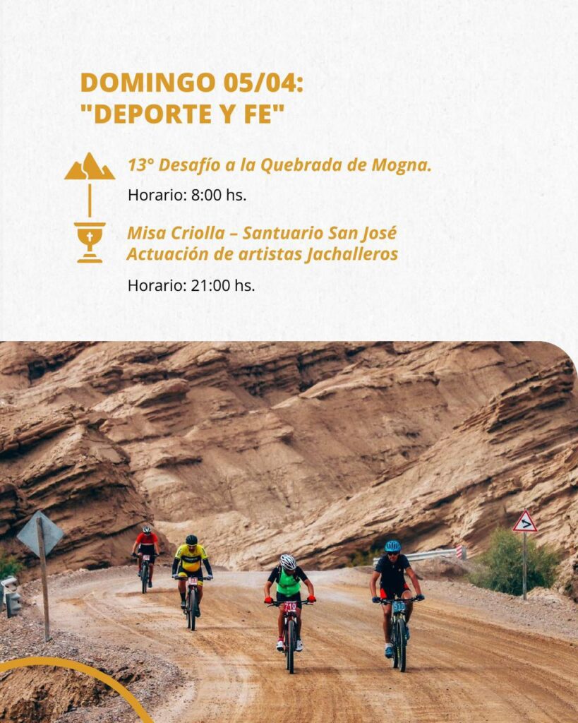 - 08:00 hs: 13° Desafío a la Quebrada de Mogna, una de las competencias de ciclismo más exigentes de la región.