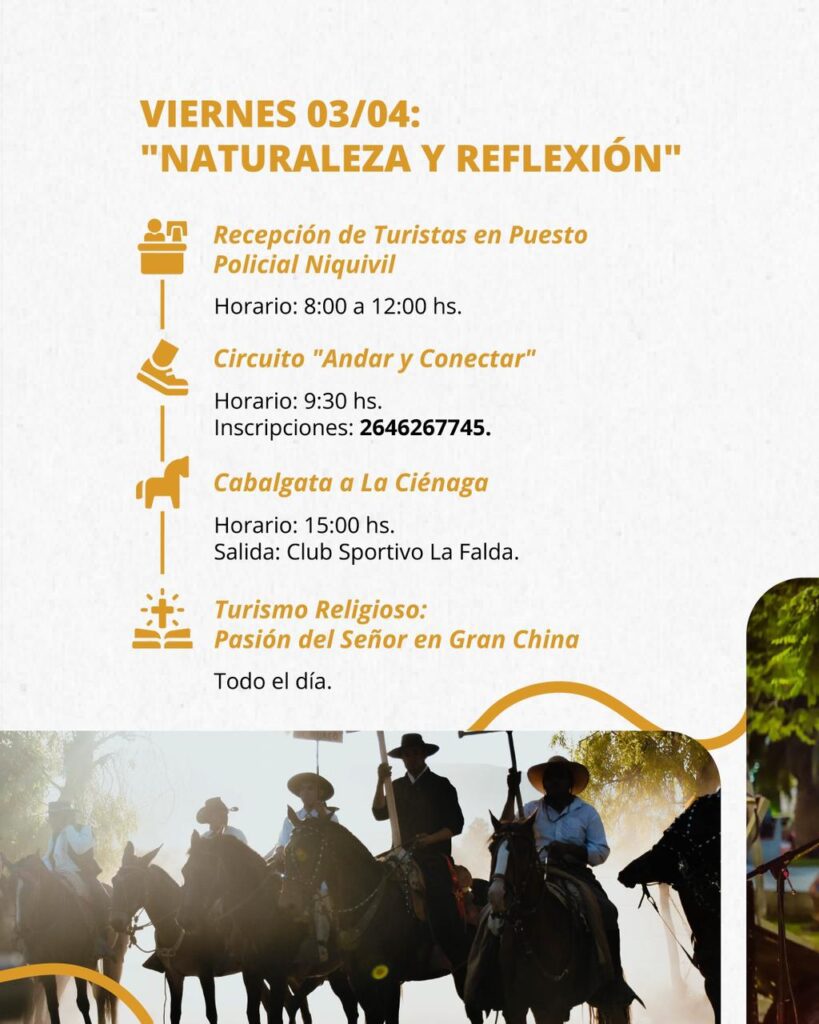 La Municipalidad de Jáchal, liderada por el Intendente Dr. Matías Espejo, y junto al coordinador de Turismo Vito Gómez, presentaron la propuesta para Semana Santa, un cronograma que combina la reflexión religiosa con el deporte de aventura y la identidad gaucha.