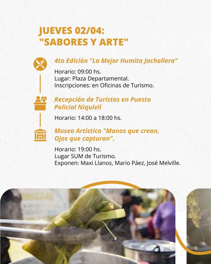 - 09:00 hs: 4ta Edición de “La Mejor Humita Jachallera” en la Plaza Departamental.